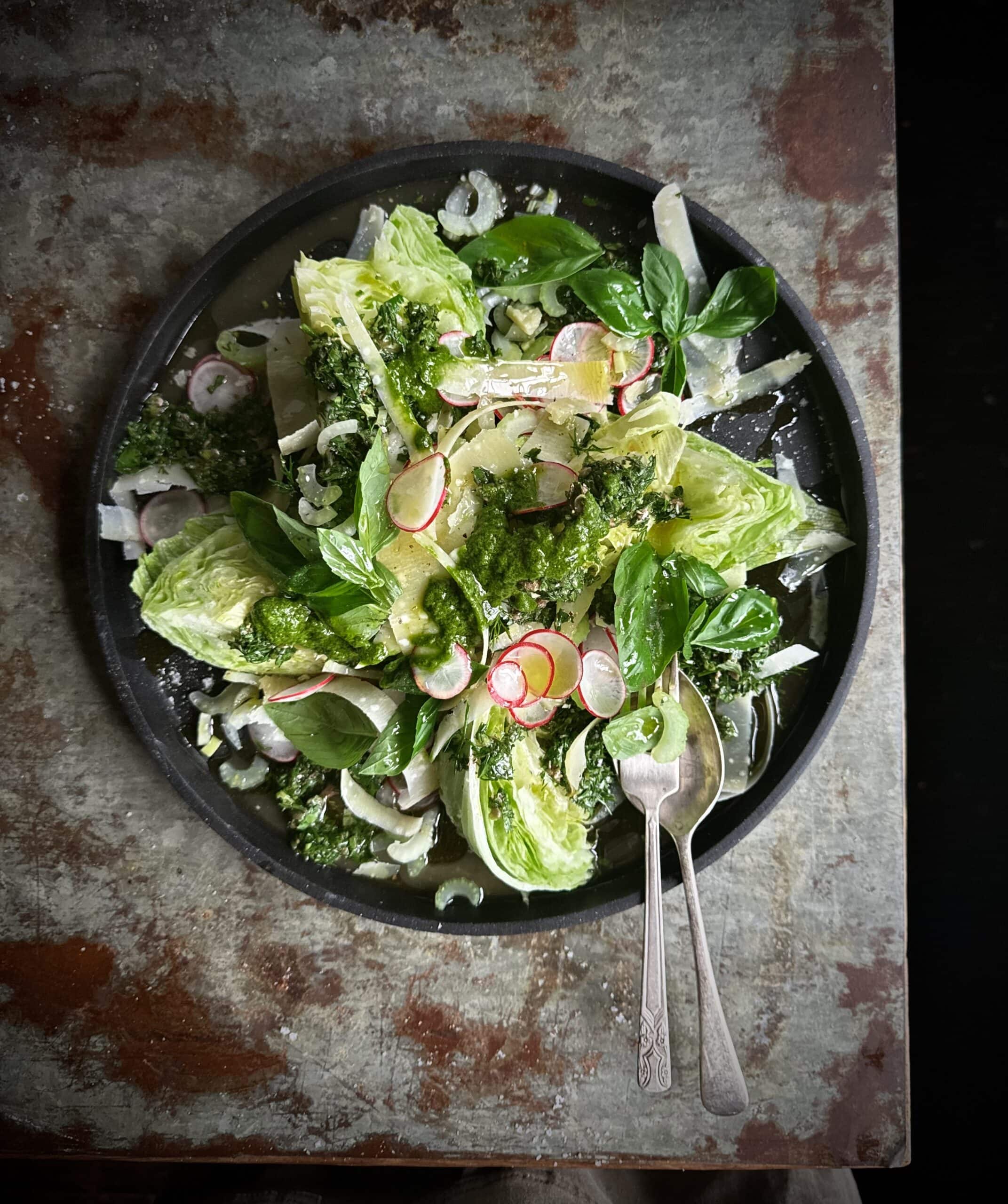 • Spoon this over the lettuce wedges and scatter with the celery, radishes, and Parmesan, finish with a squeeze of lemon to serve.